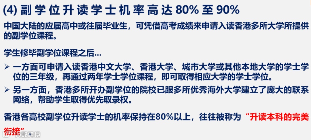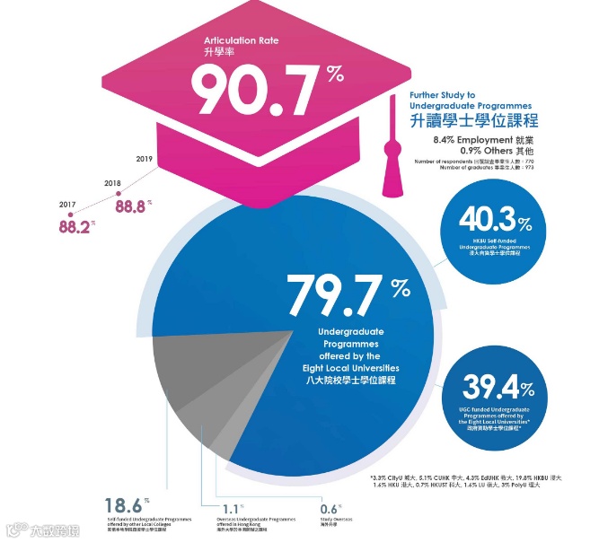 香港大学副学士的官网数据表明,有超过2/3的学生升读香港八大名校的学士学位,超过1/3的学生升读香港前三大的学士学位。