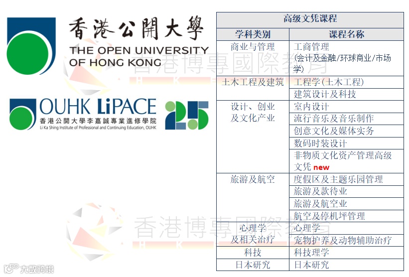 香港公开大学于1989年由香港政府成立,是一所创新教学型 大学,一直致力提供优质及灵活的大学课程包括本科、硕士及博士课程。