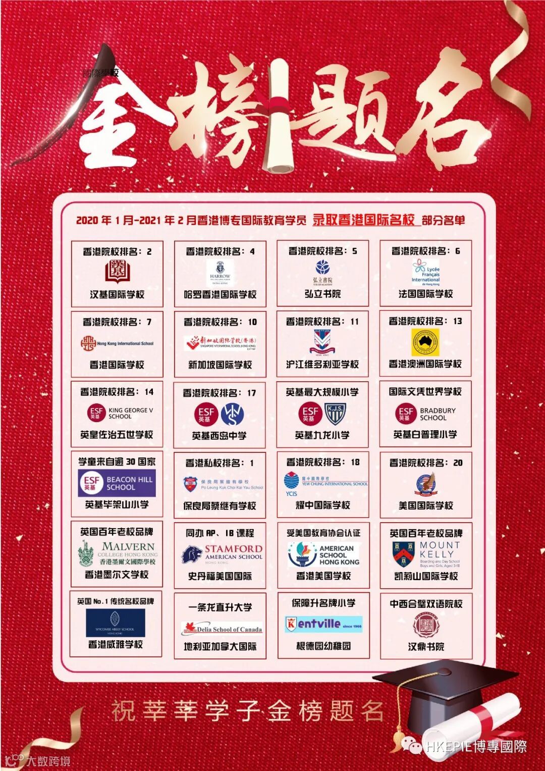 汉基国际学校、哈罗香港国际学校、弘立书院、法国国际学校、香港国际学校、新加坡国际学校、维多利亚学校、香港澳洲国际学校、英基、耀中等香港排名前20之国际名校。