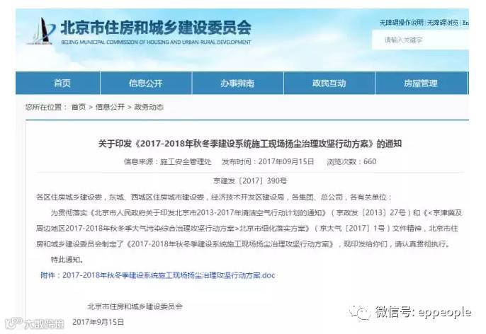 为贯彻落实《北京市人民政府关于印发北京市2013-2017年清洁空气行动计划的通知》(京政发〔2013〕27号)和《<京津冀及周边地区2017-2018年秋冬季大气污染综合治理攻坚行动方案>北京市细化落实方案》(京大气〔2017〕1号)文件精神,北京市住房和城乡建设委员会制定了《2017-2018年秋冬季建设系统施工现场扬尘治理攻坚行动方案》,现印发给你们,请认真贯彻执行。