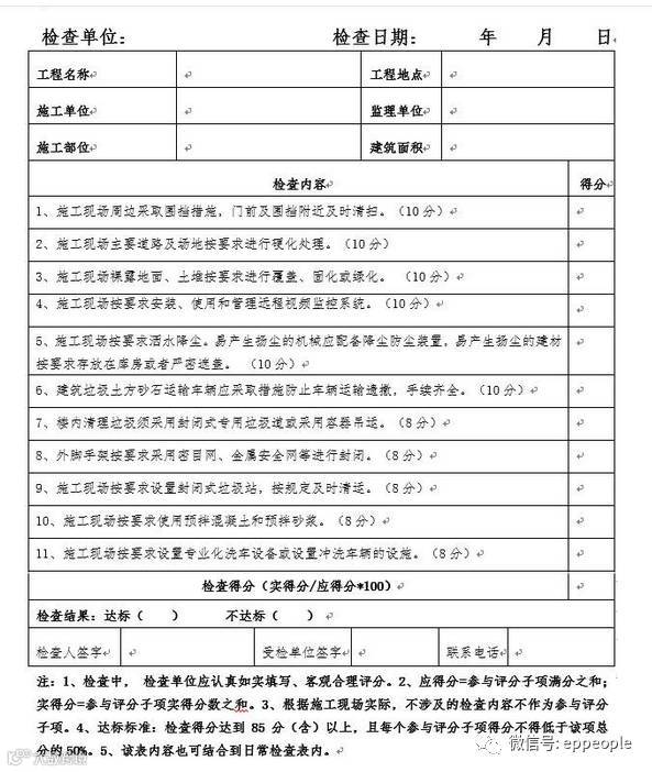 7.施工现场扬尘治理检查标准统一参照《施工现场扬尘治理专项检查(验收)表》(见附件),检查得分达到85分(含)以上,且每个参与评分子项得分不得低于该项总分的50%即为达标,低于上述标准为不达标。