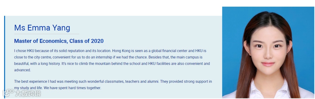 我选择香港大学是因为它的声誉。香港被视为全球金融中心,而香港大学离市中心很近,我们可以更加方便地进行实习。除此之外,香港大学校区美丽,历史悠久。 空闲的时候可以到学校后面的山上攀爬一下,舒展身心。
