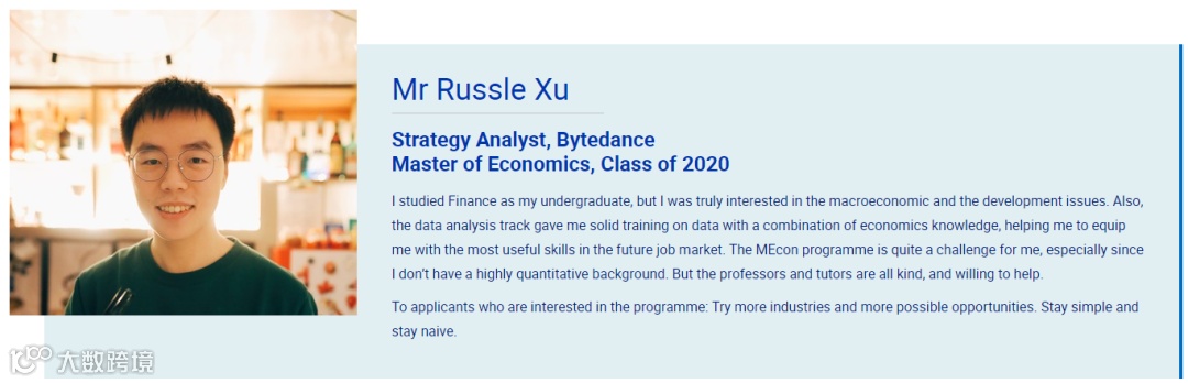 我本科生的时候是金融专修,但是我对宏观经济和发展问题确实很感兴趣。此外,数据分析还结合了经济学知识为我提供了扎实的数据培训,帮助我掌握了未来就业市场上最有用的技能。 这个专业对我来说是一个挑战,特别是因为我没有特别突出的背景。但是教授和导师都很友善,乐于助人。
