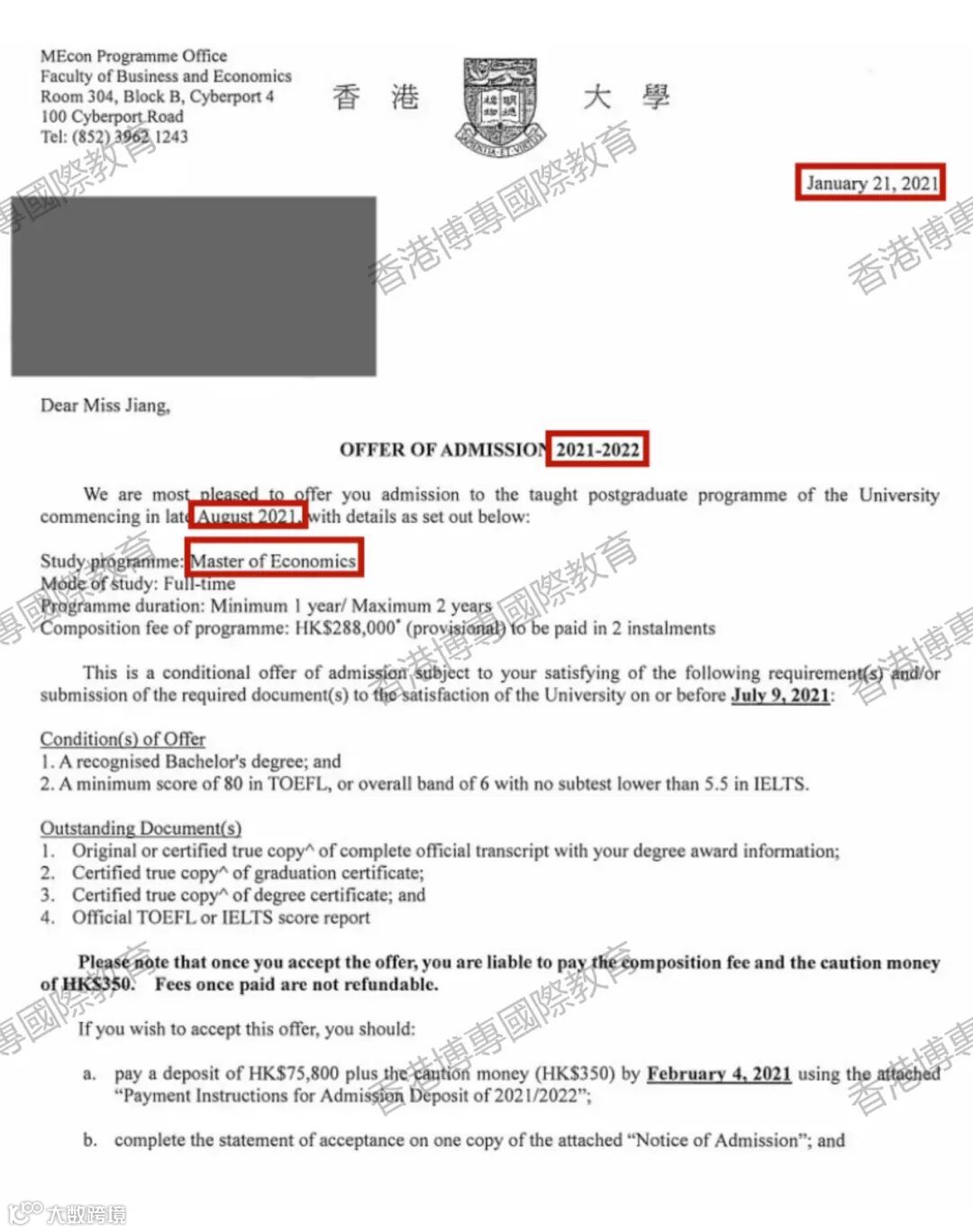 1. 蒋同学获得香港大学经济学硕士学位录取通知