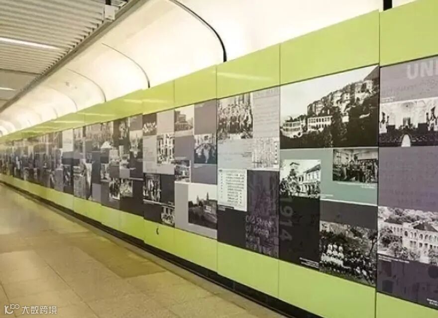 在香港大学站的走廊里,墙壁上贴着巨大的画报,介绍了香港大学的校史。
