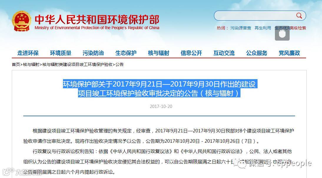 环境保护部关于2017年9月21日—2017年9月30日作出的建设项目竣工环境保护验收审批决定的公告(核与辐射)