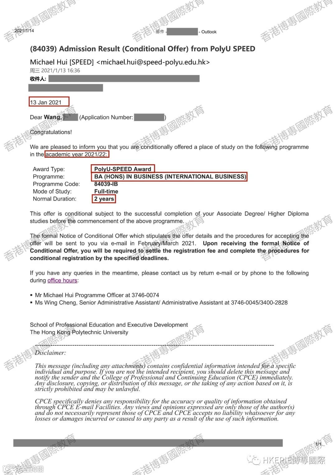 王同学两年前到香港就读香港大学副学士,截至今天,她已经斩获了香港城市大学、香港理工大学跟香港浸会大学的本科获取通知。从二本线成绩生一跃成为985大学本科生。