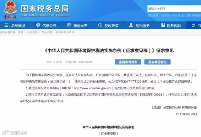 2.通过信函方式将意见寄至:北京市海淀区羊坊店西路5号国家税务总局政策法规司(邮政编码100038),并在信封上注明“环境保护税法实施条例征求意见”字样。