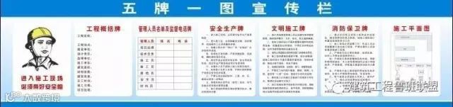 根据《建筑施工安全检查标准》规定施工现场必须设有“九五牌一图”,即:工程概况牌、管理人员名单及监督电话牌、安全生产牌、文明施工和环境保护牌、消防保卫(防火责任)牌,以及施工现场平面图。
