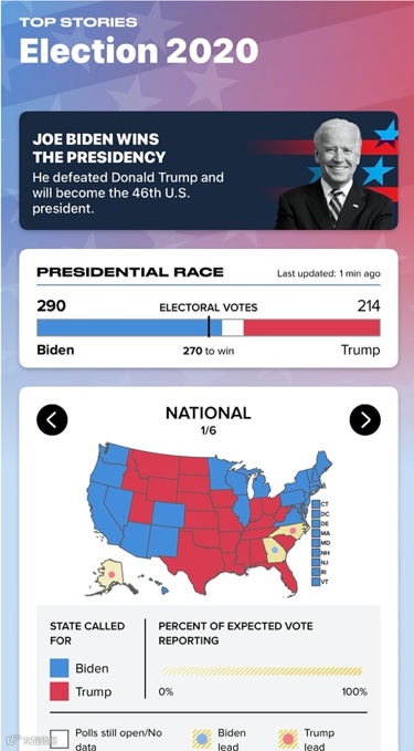 北京时间11月8日,大选结果出炉:拜登率先超过270张选票,以290票成功赢得2020美国大选。