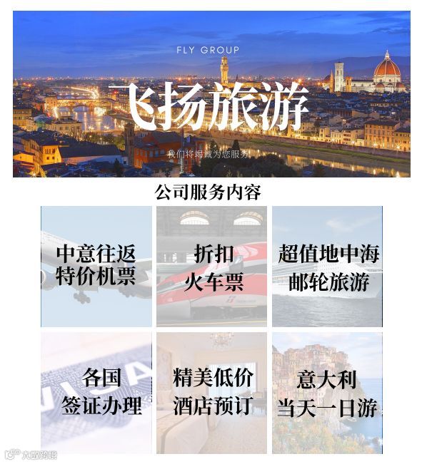 飞扬票务部拥有意大利最庞大的机票加盟商体系,在意大利拥有近40家机票加盟代理商,连续五年保持意大利全境机票销售营业额最高。年总服务人数近五万人次。