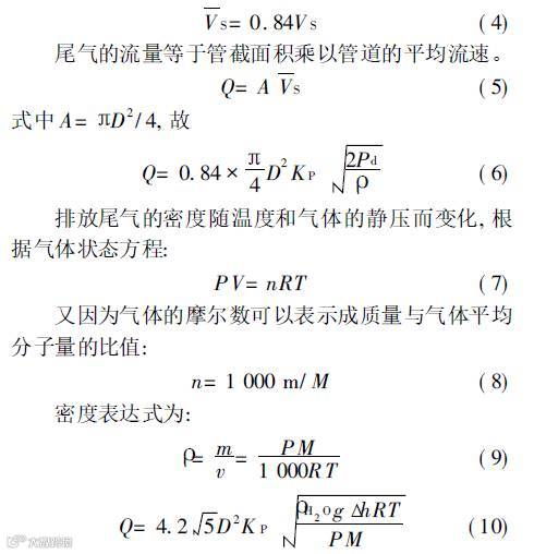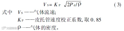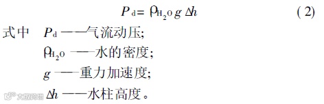 由于测得的动压为最大动压值, 所以上式计算出的是管道中最大流速。要计算气体的流量, 必须知道管道内气体的平均流速。根据参考文献[ 2] , 对于一般动压在10 mm 水柱内, 直径小于2 000 mm 的风管, 平均流速为最大流速的0. 84 倍, 即: