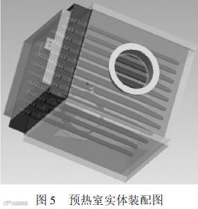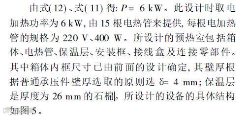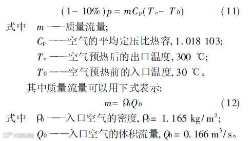 预热室的作用是使气体达到一定的温度, 然后进行催化燃烧。一般气体在100~ 300℃之间才可以有效的催化燃烧。预热室的预热是通过电加热管来实现的, 下面通过计算公式来求出电加热管的参数。假定热量损失为10% , 则根据能量守恒方程有: