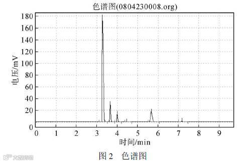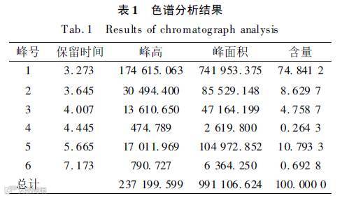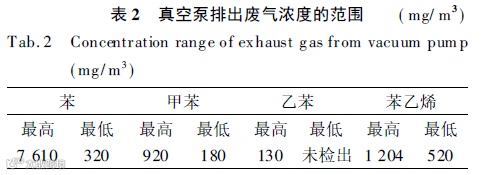 经过大气采样器采集后分析得知, 气体的成分主要为苯、甲苯、苯乙烯。然而由于大气采样器收集的是某个时间段内的气体, 具体分析还需精确测试。因此,以下的实验采用50 mL 注射器在真空泵排出口每隔一段时间取一个20 mL 样品, 用橡胶帽封好注射器入口, 编好序号。把样品带到实验室进行色谱分析, 得到的色谱图如图2, 分析结果见表1。大气采样器的分析结果如表2。