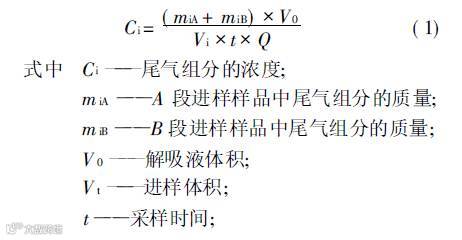 用盛有10 mL 二硫化碳的具塞试管分别对A、B段活性碳吸附的有机尾气进行解吸, 解吸30 min 后, 用该解吸液进行测定, 进样量选用1L。根据气相色谱分析所得谱图中的峰面积, 由标准曲线可以换算出进样量中所含有机尾气的毫克数, 假定其质量为mi , 那么该有机尾气在空气中的浓度可用下式计算:
