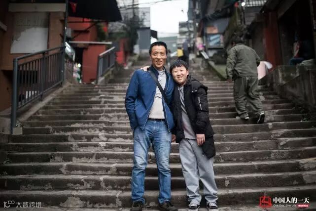 照片中的“棒棒”冉光辉扛着一百多斤货物,牵着三岁的儿子冉俊超走下重庆朝天门批发市场旁的梯坎,叼着烟,从容淡定。