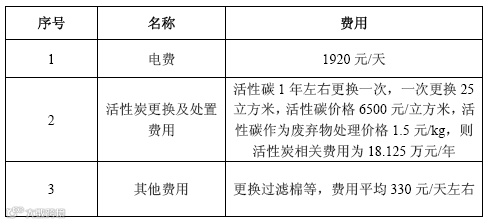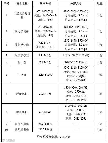 该处理系统废气总排放量约为140000m3/h,工艺相关设备及投资情况见下表: