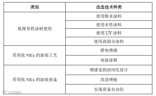 根据现场和文献调研,在低VOCs的涂装设备相关改造方面,喷漆室的封闭化设计、改进喷枪、实现设备自动化等技术改造尤为重要。