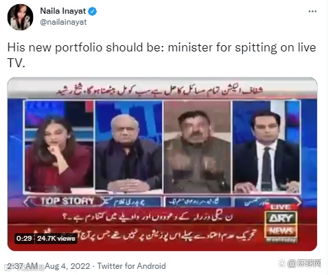 据印度《第一邮报》等多家印媒报道,在当地时间4日一档电视直播节目中,巴基斯坦前内政部长谢赫·拉希德·艾哈迈德狠批现内政部长拉纳·萨努拉,说到激动处时他竟“吐了口水”,这一“失态”表现引发网友议论。