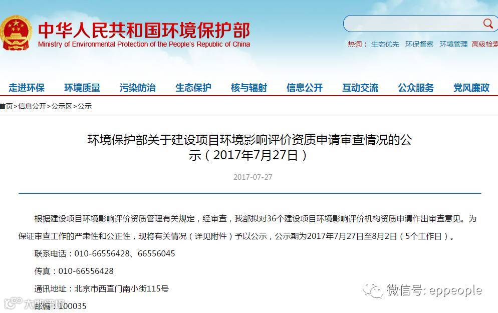 环境保护部关于建设项目环境影响评价资质申请审查情况的公示(2017年7月27日)