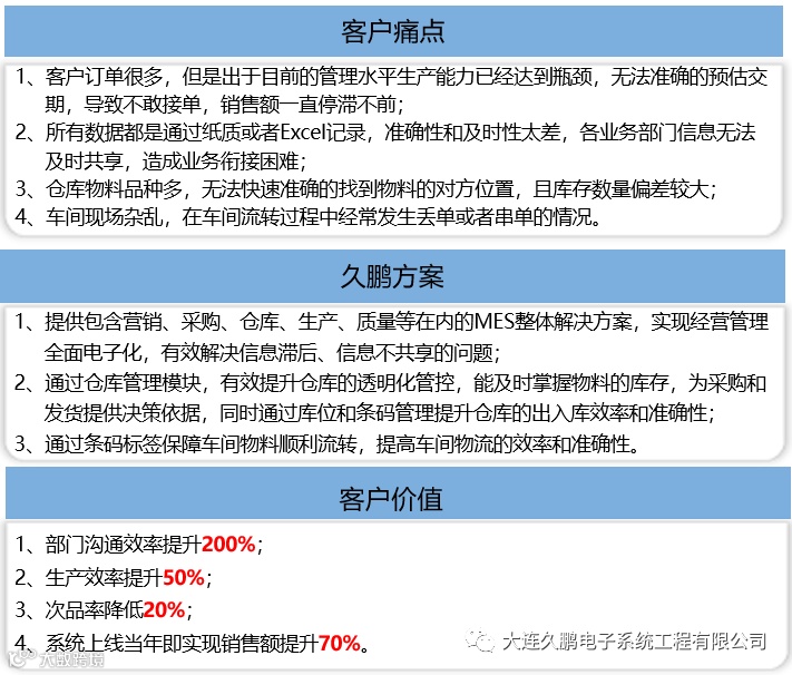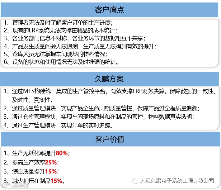 大连久鹏电子系统工程有限公司基于专业的工业物联网硬件技术和制造执行系统软件技术,打造的工业物联网平台和制造执行系统平台。源于我们对嵌入式硬件系统的研发能力、云计算软件系统的开发能力和工业自动化系统的工程能力。