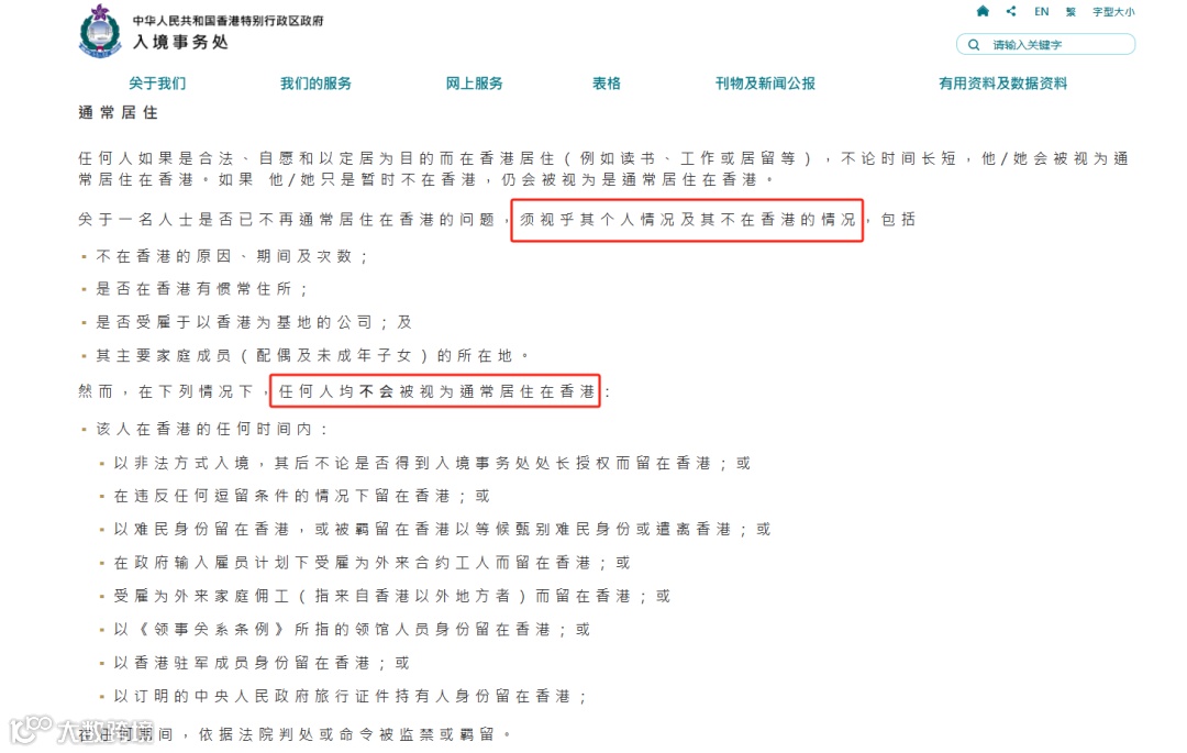 香港入境处官网显示,入境处在审核“通常居住”时的主要考虑因素如下: