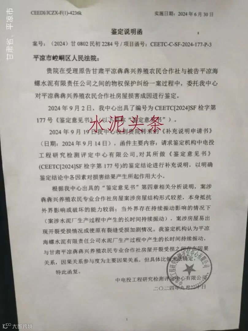 根据网友留言的一份中电投工程研究检测评定中心有限公司出具的报告显示:鉴定机构认为平凉海螺水泥有限责任公司水泥厂生产过程中产生的长时间持续振动,与甘肃平凉犇犇兴养殖农民专业合作社房屋开裂受损之间存在因果关系。鉴定报告如下: