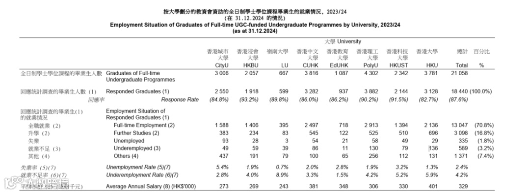香港大学教育资助委员会近日公布2023/2024学年本港八所资助大学的学士课程毕业生就业情况统计调查。