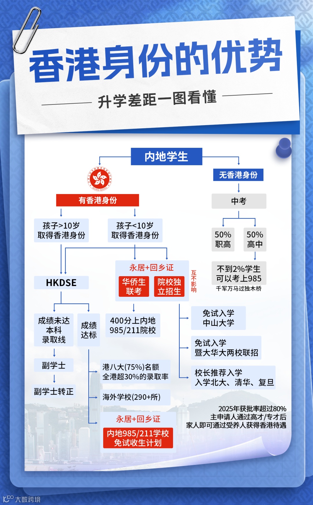 如果能规划到永居身份,也有机会通过DSE或者港澳联考,以低分优势报考内地大学。不过永居需要7年,最好是在孩子10岁之前开始准备。