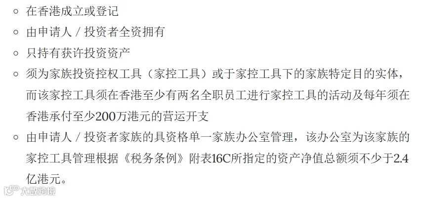 透过申请人全资拥有的合资格私人公司的投资将可计入新计划的合资格投资金额内。所指的“合资格”,是由申请人全资拥有并在香港成立或登记的控股公司,并以家控工具或于其下家族特定目的实体的形式成立,而该公司须由《税务条例》(第112章)附表16E第2条所界定的具资格单一家族办公室管理。