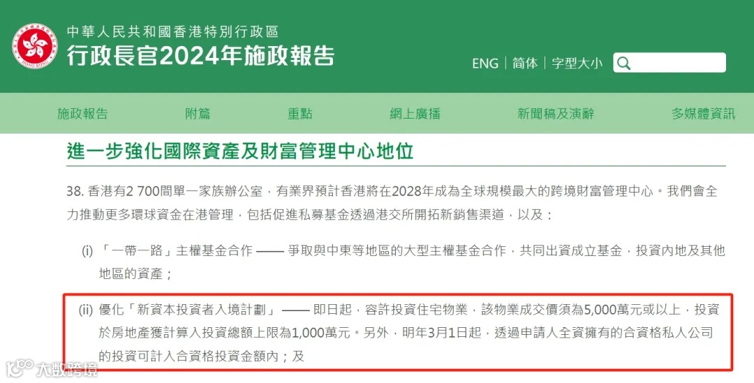 当即容许投资住宅物业,宣告时隔14年的买房投资回归!不过该物业成交价必须5,000万港元或以上。并且申请人投资于房地产(含住宅及非住宅物业)的计入上限为1,000万港元。
