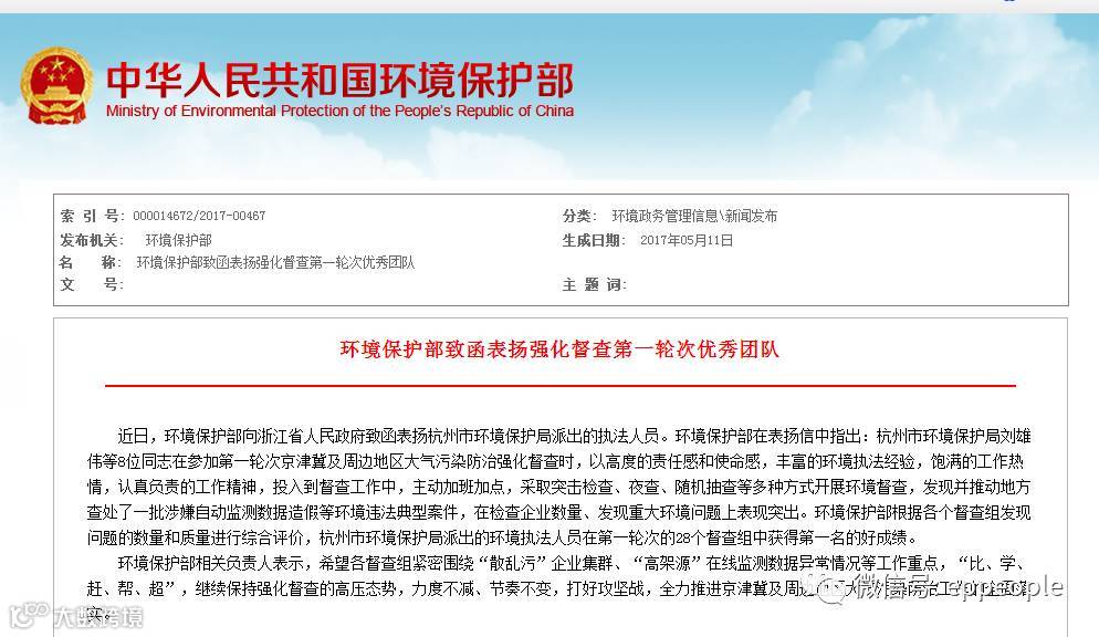 近日,环境保护部向浙江省人民政府致函表扬杭州市环境保护局派出的执法人员。环境保护部在表扬信中指出:杭州市环境保护局刘雄伟等8位同志在参加第一轮次京津冀及周边地区大气污染防治强化督查时,以高度的责任感和使命感,丰富的环境执法经验,饱满的工作热情,认真负责的工作精神,投入到督查工作中,主动加班加点,采取突击检查、夜查、随机抽查等多种方式开展环境督查,发现并推动地方查处了一批涉嫌自动监测数据造假等环境违法典型案件,在检查企业数量、发现重大环境问题上表现突出。环境保护部根据各个督查组发现问题的数量和质量进行综合评价,杭州市环境保护局派出的环境执法人员在第一轮次的28个督查组中获得第一名的好成绩。