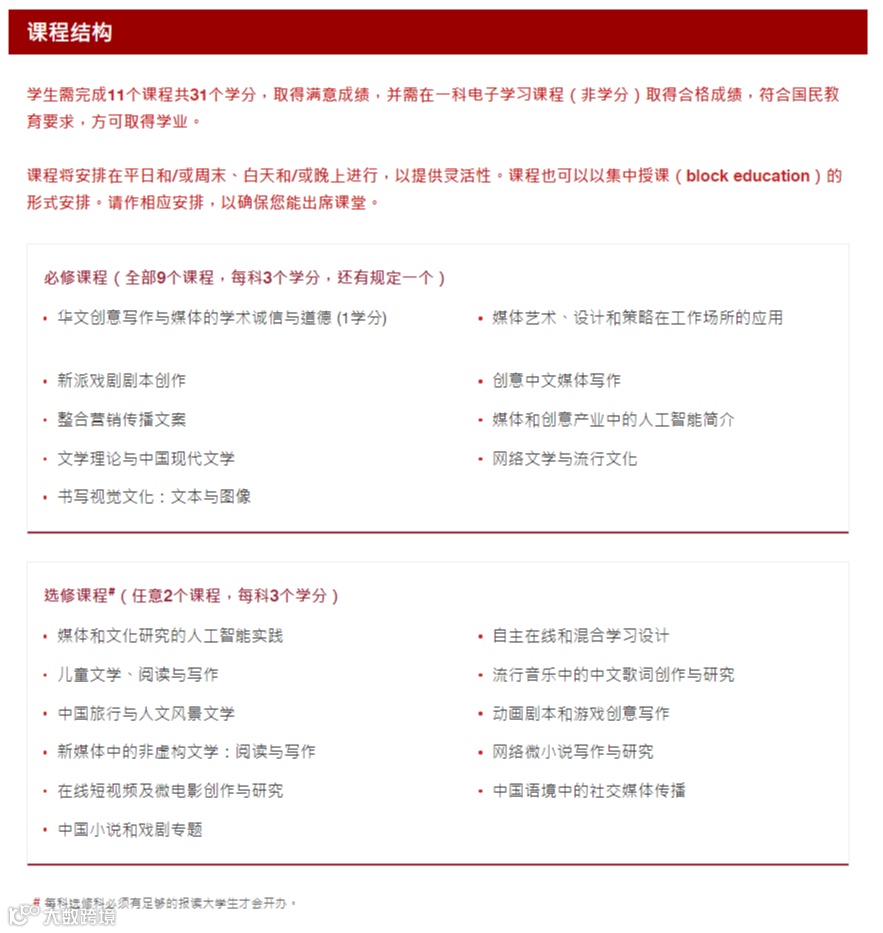 部分专业如「中文创意写作及媒体文化文学硕士」采用纯中文授课,无英语成绩硬性要求;年满25周岁的申请者可豁免雅思/托福。