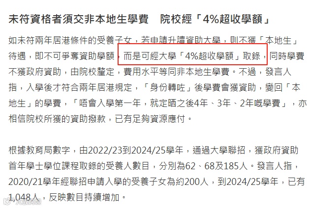 但如果未来不符合居港规定,以自资形式入读教资会资助第一年学士学位课程,则不会计入1.5万个本地生资助学额内,但大学可酌情以“超额收生”形式作为取录。