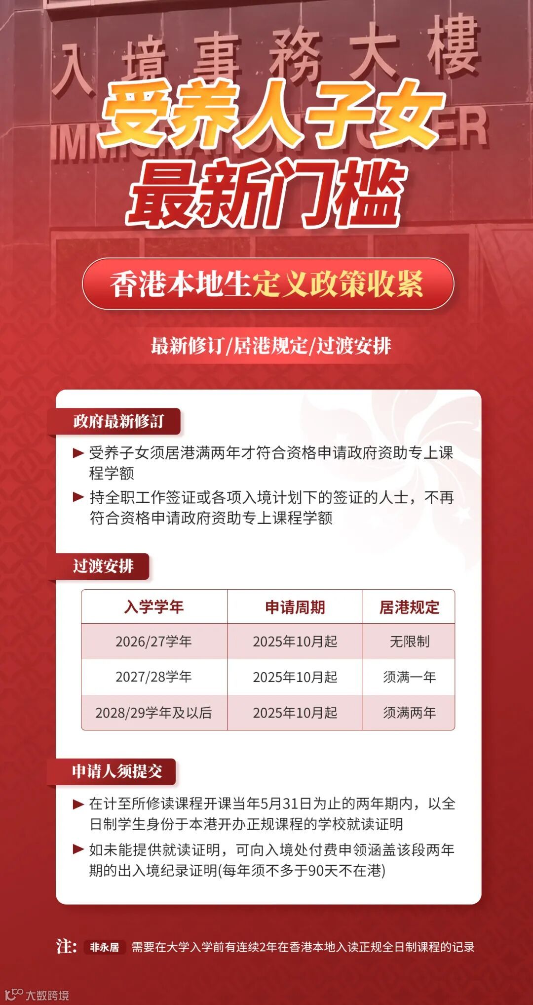 2028届考生:最迟要在2026年9月入读香港中五,至2028年5月31日保持在读身份;或2026年5月31日在香港开始居住,至2028年5月31日两年期间,每年居港不低于275天。
