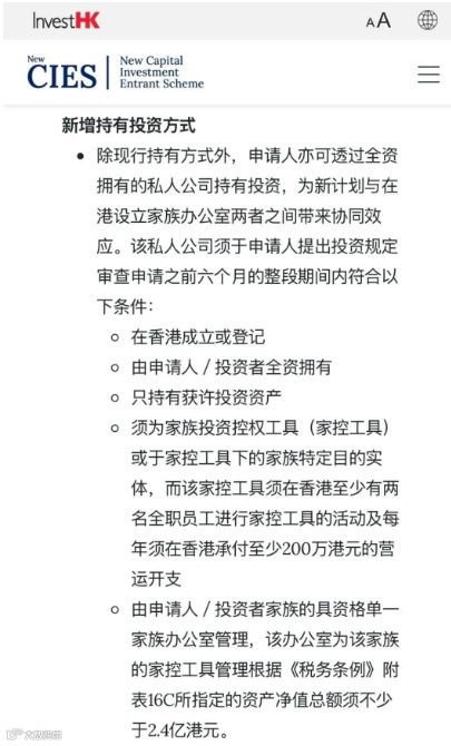 除现行持有方式外,申请人还可通过全资拥有的私人公司进行投资。该私人公司须符合一系列条件,如在香港成立或登记、由申请人全资拥有、只持有获许投资资产等。
