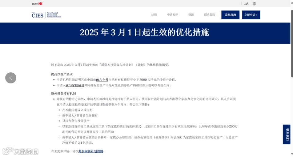 2025年1月7日,香港政府宣布对“新资本投资者入境计划”进行重大优化,进一步放宽投资移民门槛。目前新政优化措施已经自2025年3月1日起正式实施生效。