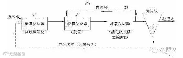 70年代,美国专家在A/O工艺的基础上,再加上除磷就成了A2O工艺(如图5)。我国1986年建厂的广州大坦沙污水处理厂,采用的就是A2O工艺,当时的设计处理水量为15万吨,是当时世界上最大的采用A2O工艺的污水处理厂。