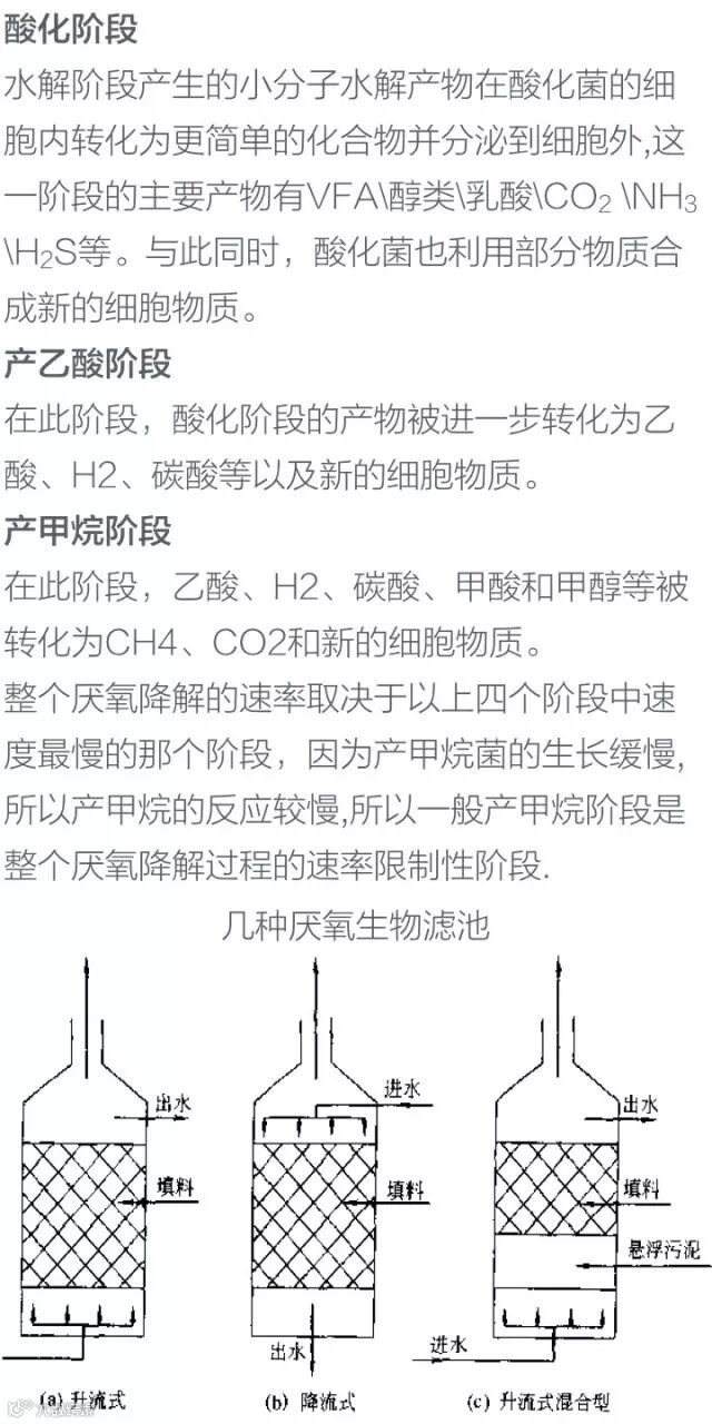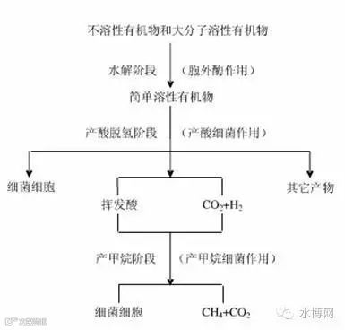 可分为四个阶段:水解阶段、酸化阶段(也叫发酵阶段)、产乙酸阶段、产甲烷阶段。
