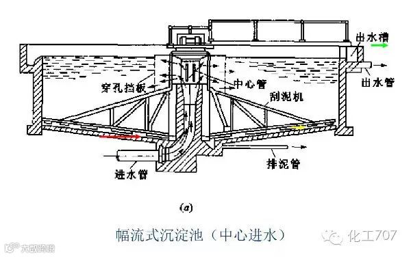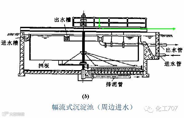 (3)辐流式池:最适宜于大型水处理厂采用,有定型的排泥机械,运行效果较好,但要求较高的施工质量和管理水平;