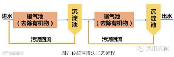 早期的两段法只是将一套活性污泥法的两组构筑物串联,一段和二段曝气池体积相同,且多合并建设,大部分有机物在第一段被吸附降解,第二段的污泥负荷很低,其出水水质要优于相同体积曝气池的单级活性污泥法(如图7)。然而,由于第一段曝气池体积减小了一倍,相当于污泥负荷增加了一倍,处在易发生污泥膨胀的阶段,运行管理较为困难。