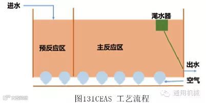80 年代初,连续进水的 ICEAS 工艺诞生(如图13)。该工艺在传统的SBR工艺基础上,在反应池中增加一道隔墙 ,将反应池分隔为小体积的预反应区和大体积的主反应区,污水连续流入预反应区,然后通过隔墙下端的小孔以层流速度进入主反应区,解决了间歇式进水的问题。