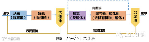 其后,为了解决脱氮时硝化菌需要长泥龄,除磷时聚磷微生物需要短泥龄的矛盾,开发了AO-A2O工艺(如图9)。该工艺由两段相对独立的脱氮和除磷工艺组成,第一段泥龄短,主要用于除磷,第二段泥龄长、负荷低,用于脱氮。