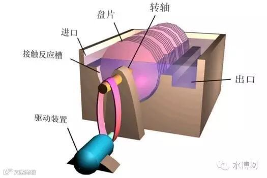 一种好氧处理污水的生物反应器,由水槽和一组圆盘构成,圆盘下部浸没在水中,圆盘上部暴露在空气中,表面生长有生物群落,转动的转盘周而复始接触污水和空气中的氧,使污水得到净化。