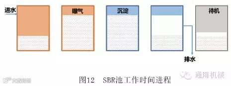 序批式活性污泥法(SBR)工艺是在时间上将厌氧段与好氧段进行分割。20 世纪70 年代初由美国Irvine公司开发。它在流程上只有一个基本单元,集调节池、曝气池和二沉池的功能于一池,进行水质水量调节、微生物降解有机物和固液分离等。经典 SBR 反应器的运行过程为:进水→曝气→沉淀→滗水→待机(如图11、 12)。