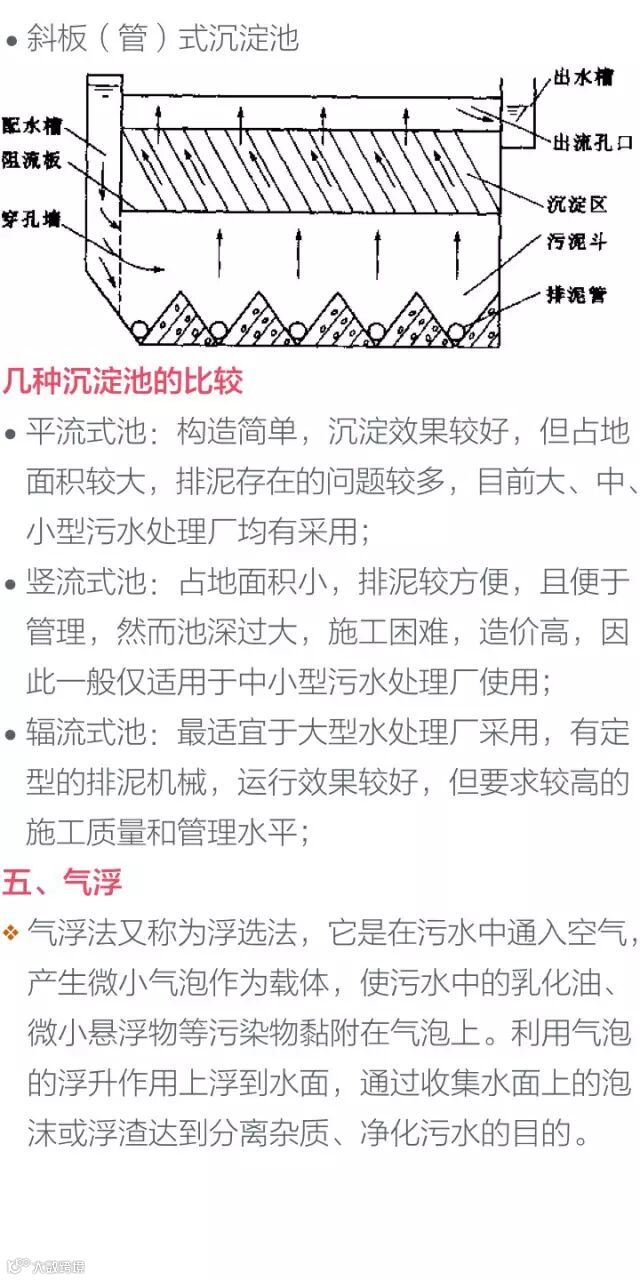 (4)斜流式池:主要适用于初沉池,在给水处理中应用较广,沉淀效率高,停留时间短,占地少,缺点是容易滋生藻类等,排泥困难、易堵塞,维护不便。