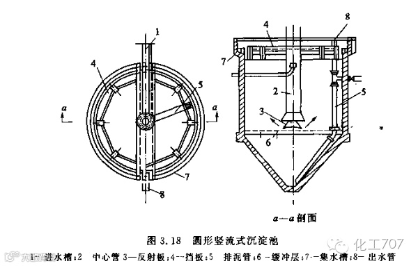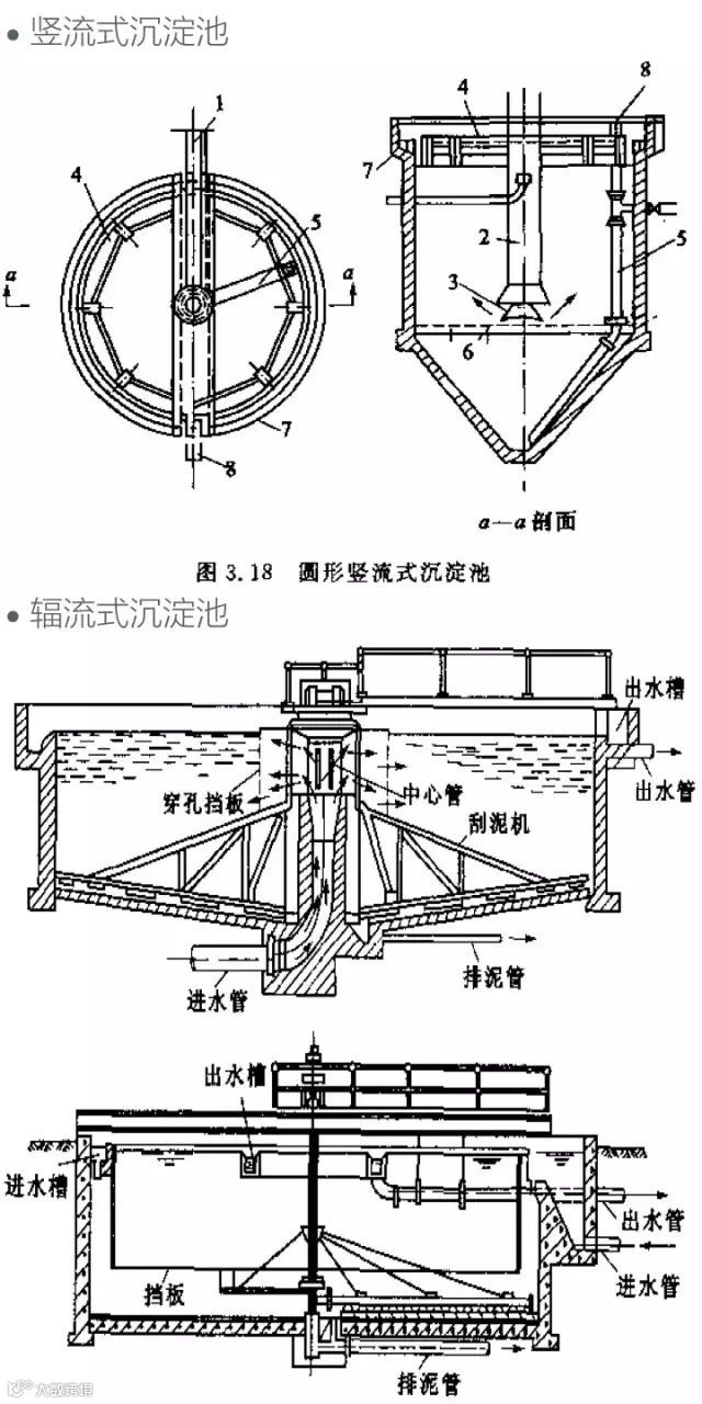 (2)竖流式池:占地面积小,排泥较方便,且便于管理,然而池深过大,施工困难,造价高,因此一般仅适用于中小型污水处理厂使用;
