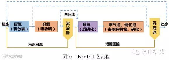 在AO-A2O工艺基础上奥地利研发出了Hybrid工艺(如图10),该工艺的两段之间有三个内回流装置,可以为第一段曝气池提供硝态氮、硝化菌以及为第二段曝气池提供碳源。第一段主要是去除有机物和磷,第二段是硝化功能,并靠第一段曝气池回流混合液进行反硝化脱氮。
