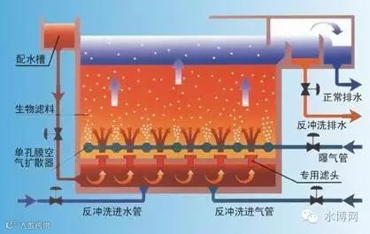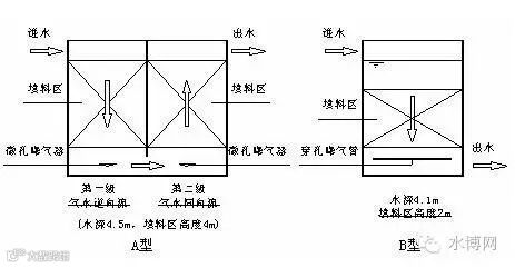 结构包括池体,填料,布水装置,曝气装置。工作原理为:在曝气池中设置填料,将其作为生物膜的载体。待处理的废水经充氧后以一定流速流经填料,与生物膜接触,生物膜与悬浮的活性污泥共同作用,达到净化废水的作用。