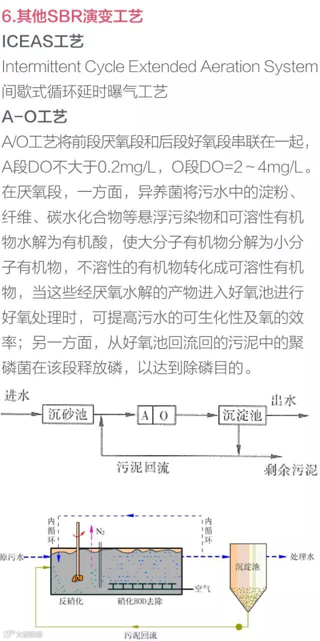 (1)传统的SBR法:SBR工艺即间歇活性污泥法,它由一个或多个曝气反应池组成,污水分批进入池中,经活性污泥净化后 ,上清液排出池外即完成一个运行周期。每个工作周期顺序完成进水 、反应 、沉淀 、排放 4 个工艺过程。